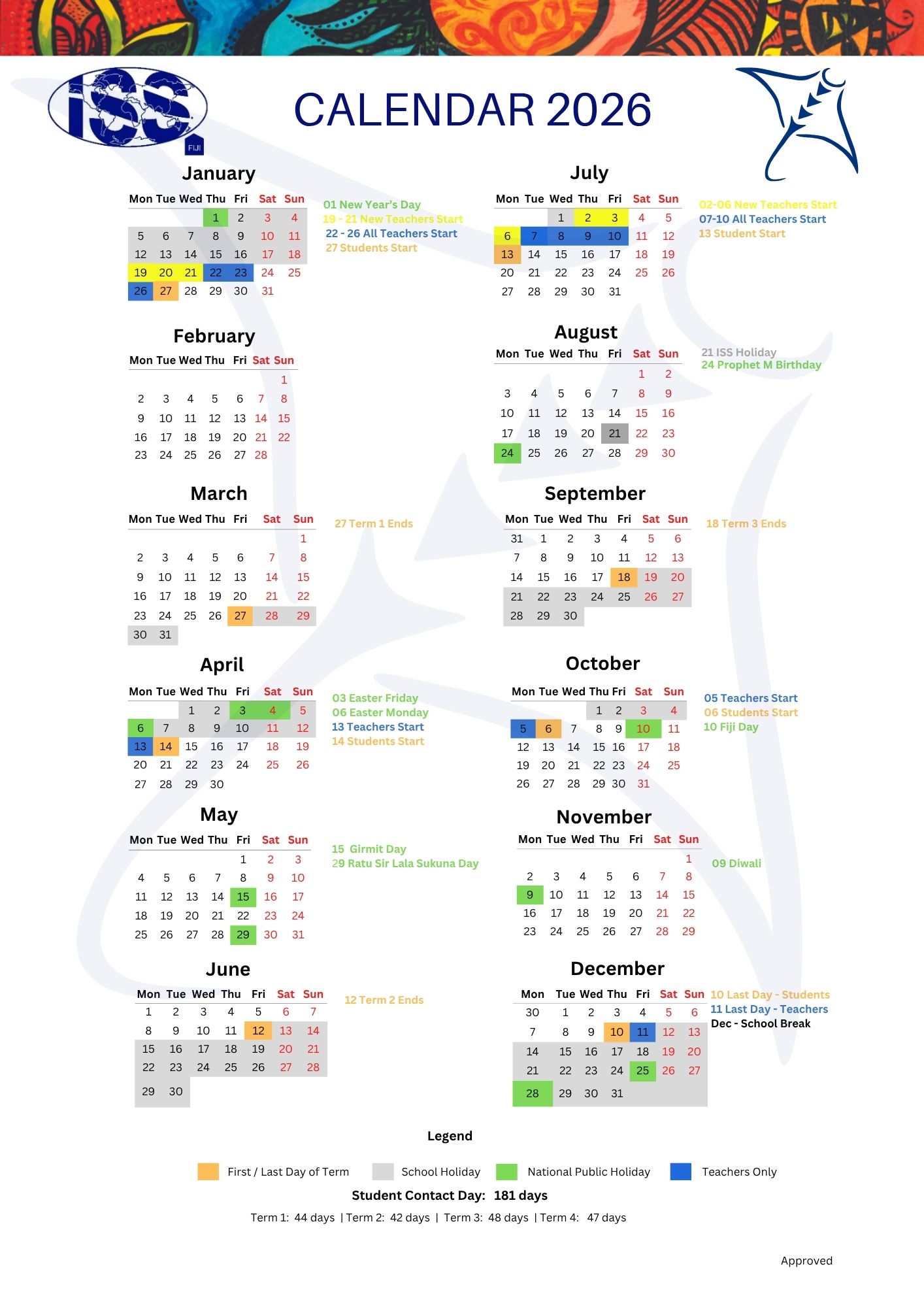 From academic milestones to cultural festivals, our calendar reflects the rigorous academic learning and rich diversity of our school community. For more detailed information, please access our ISS dynamic calendar through our parent portals.